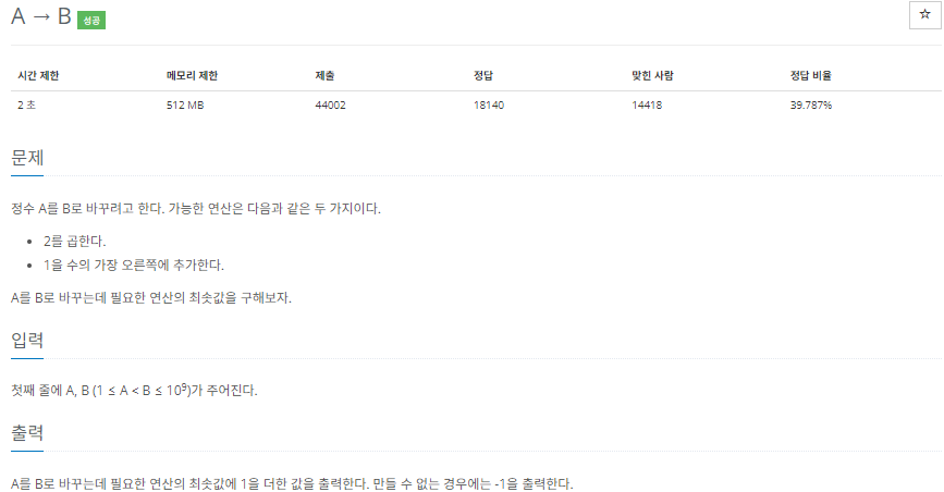 A에 2를 곱하거나, 1을 가장 오른쪽에 추가하여 수 B를 만드는 간단한 문제이다.